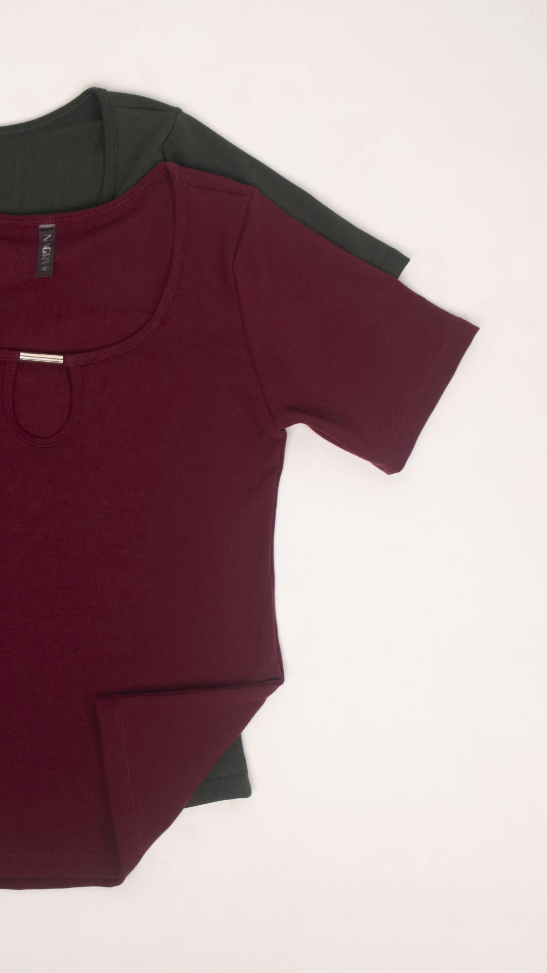 El escote en forma de gota aporta un punto de luz sutil en el frente, acompañado de un accesorio plateado que realza la prenda sin exagerar. La manga corta y su diseño la hacen ideal para ocasiones casuales donde quieres sentirte cómoda, femenina y segura.