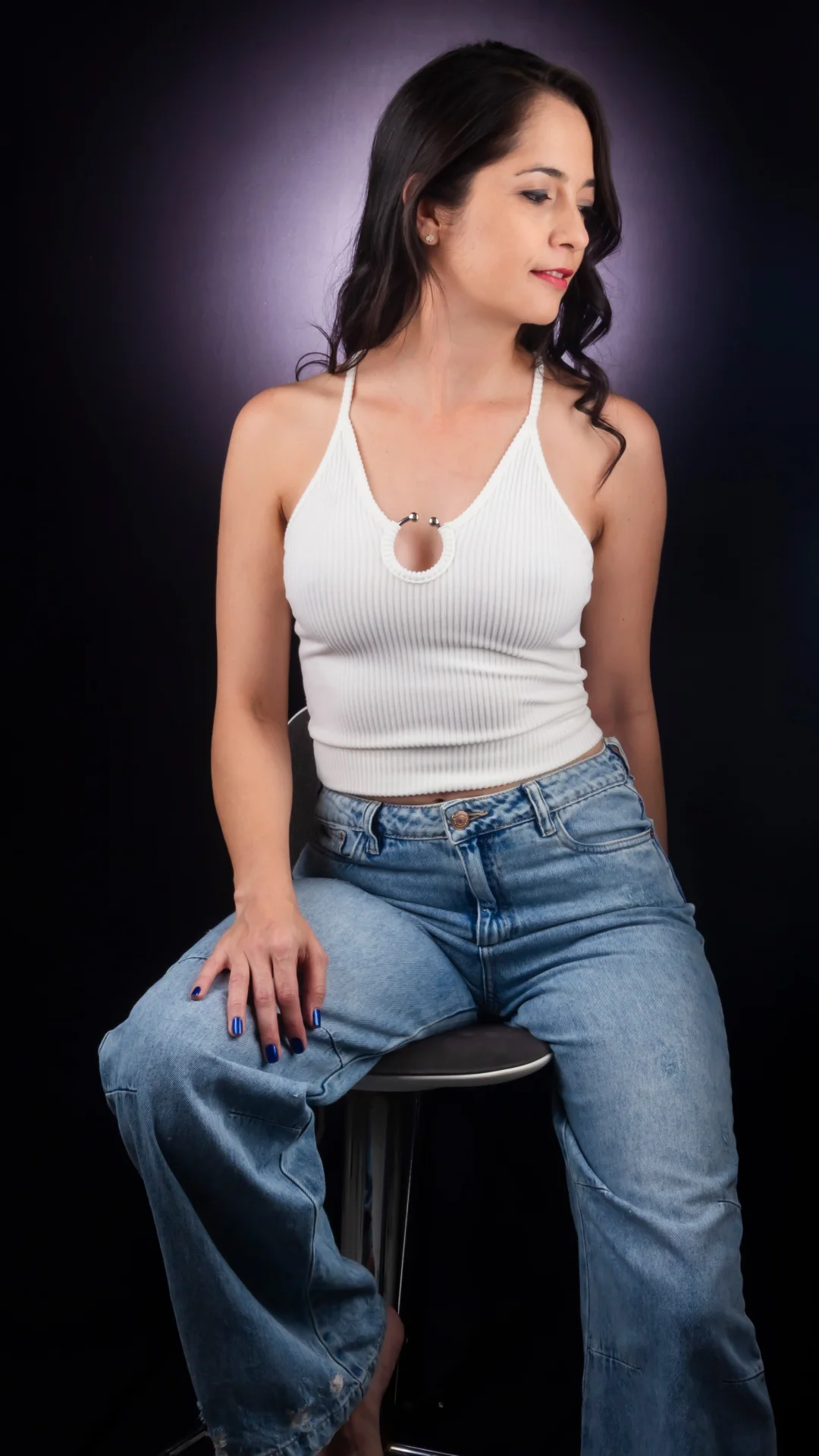 El escote en V estiliza, mientras la argolla central aporta un toque armónico que resalta sin exceso.